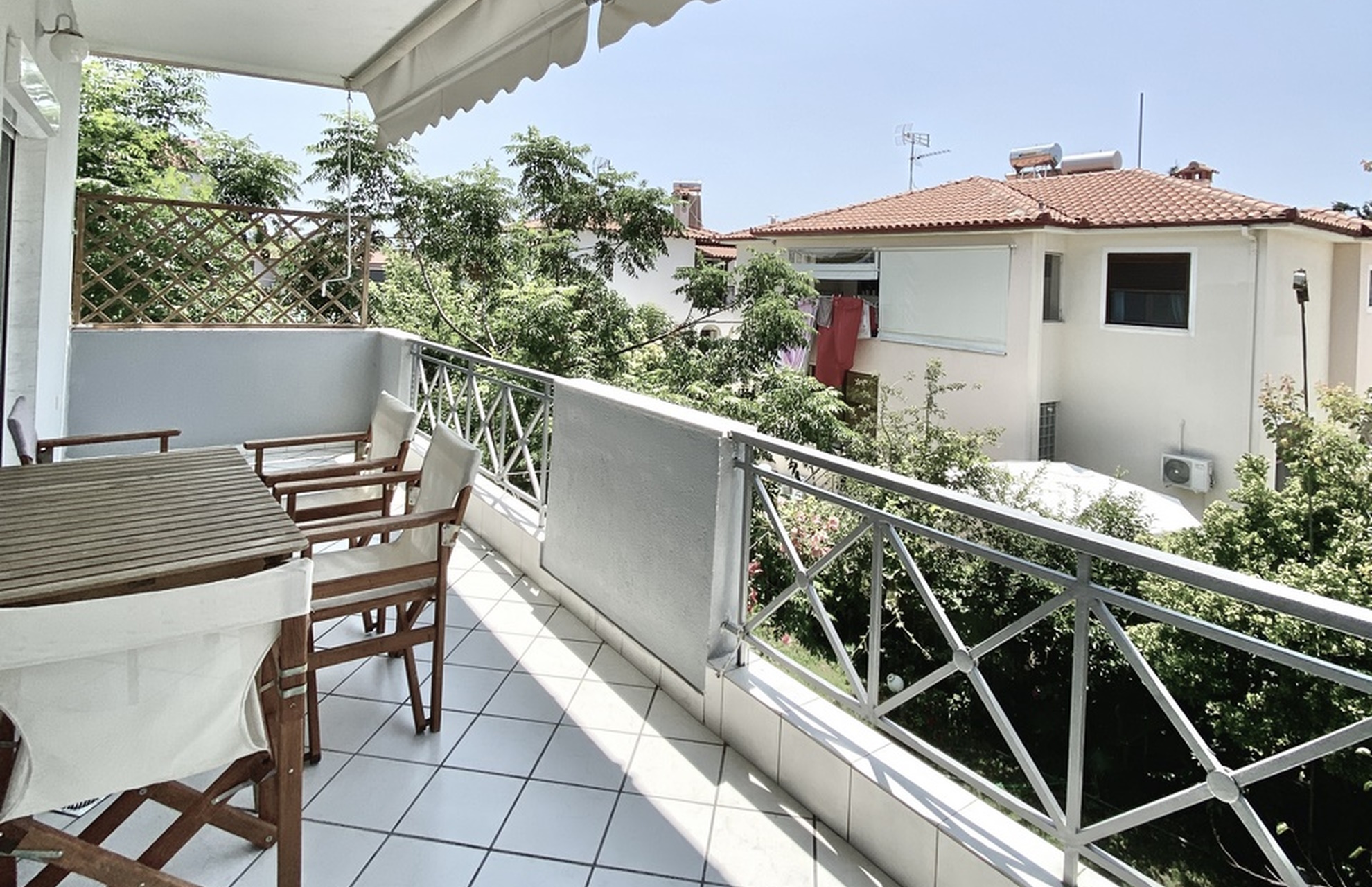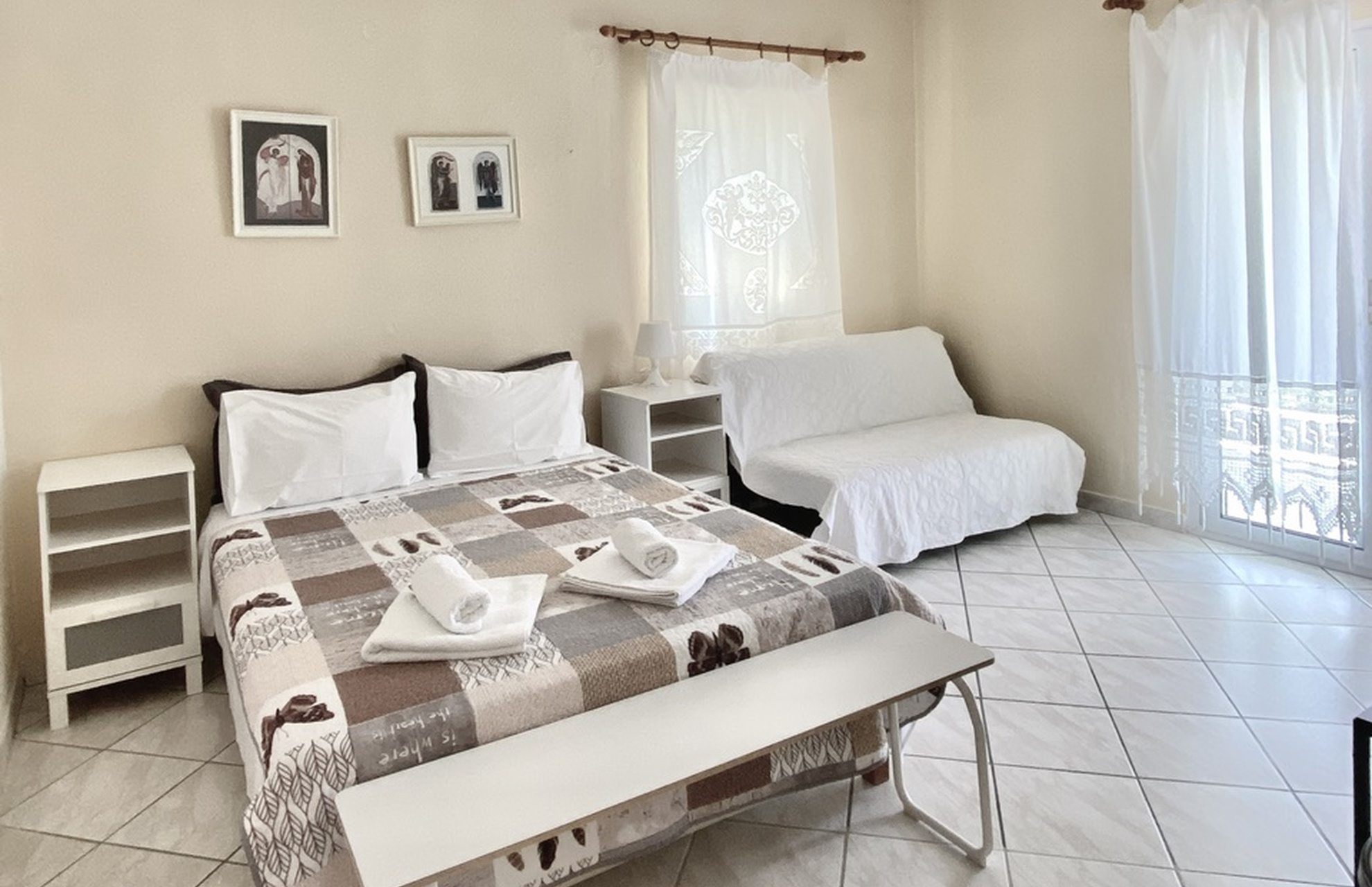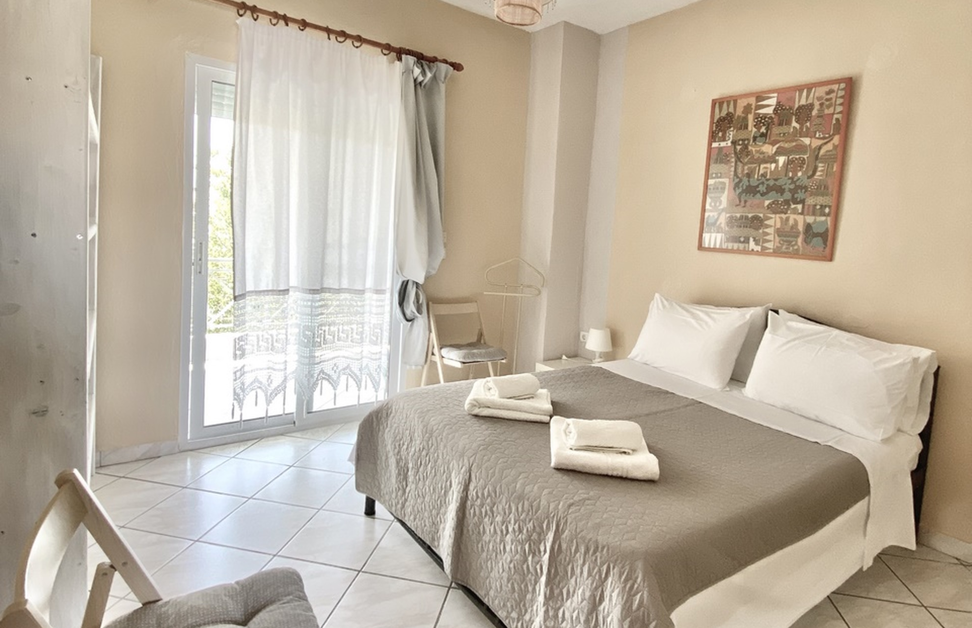 Αpartment on the first floor with two separate rooms and a large balcony overlooking the garden. Suitable for accommodating 4-5 people.